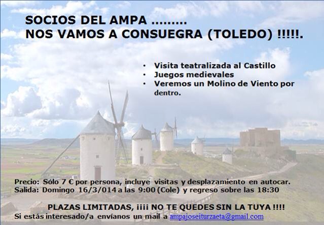 Hemos organizado una excursión a Consuegra (Toledo) para el próximo Domingo 16 de marzo de 2014, con el fin de que nuestros peques conozcan la historia de manera amena y divertida !!!!