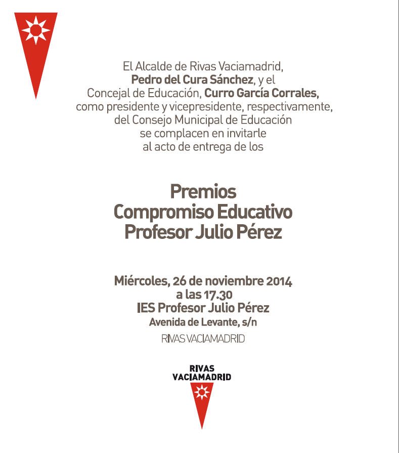La concejalía de educación del ayuntamiento de Rivas nos ha enviado esta invitación que hacemos publica para todos vosotros. En esta entrega de premios se pretende realizar un reconocimiento público a la labor de aquellas personas destacadas por su labor a favor del compromiso con los valores de la educación pública.
