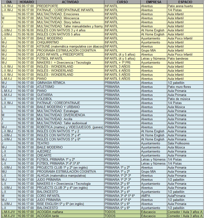 Para el próximo curso 2025-26, hay programadas muchas actividades extraescolares que se desarrollan en el Centro, tanto para Educación Infantil como Primaria. Podéis encontrar el desglose de días y localizaciones previstos en la siguiente tabla: