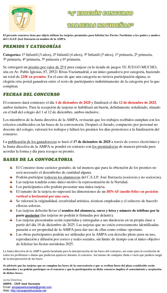 Las obras participantes podrán ser utilizadas por la AMPA con derecho pleno para su uso, reproducción y difusión por correo y redes sociales, sin límite de tiempo con el único objetivo de felicitar las fiestas navideñas 2025.