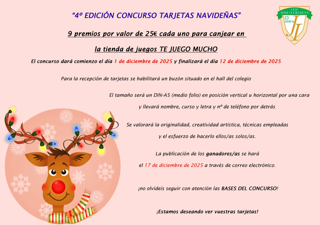 El presente concurso tiene por objeto utilizar las tarjetas premiadas para felicitar las Fiestas Navideñas a los padres y madres del C.E.I.P. José Iturzaeta en nombre de la AMPA.