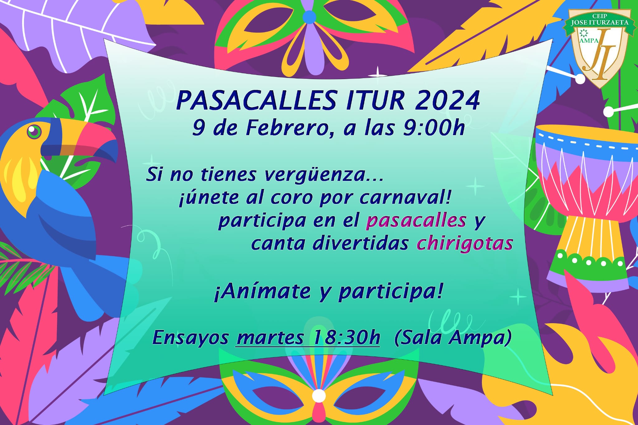 Y aunque finalmente fue un poco pasado por agua, el Carnaval se celebró en el Itur y nuestr@s peques han disfrutado mucho de la fiesta. Aquí podéis disfrutar de un vídeo con parte de la actuación chirigotera que algunas familias han estado preparando con mucha ilusión para compartir con l@s alumn@s y resto del equipo del Cole. ¡Gracias a nuestro letrista José Luis, al Equipo Directivo por dejarnos participar y a l@s profes por su colaboración!